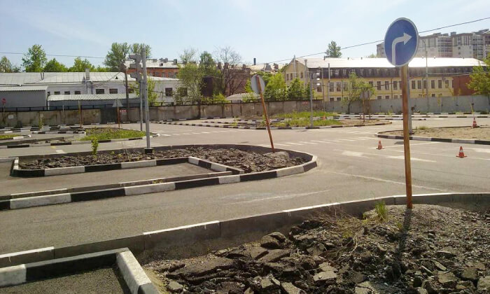 Развернуться необходимо, не задев границ разметки. Данное умение в дальнейшем поможет осуществлять развороты во дворах, тупиках, на парковке и при любой другой необходимости.