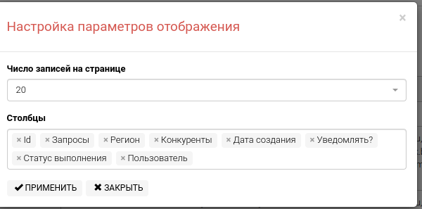 Для сортировки от А до Я и от Я до А доступны поля: запросы, дата создания, уведомление, статус выполнения и id. Чтобы скрыть избыточную информацию или увеличить количество результатов работы можно настроить через “шестеренку” в правом верхнем углу.