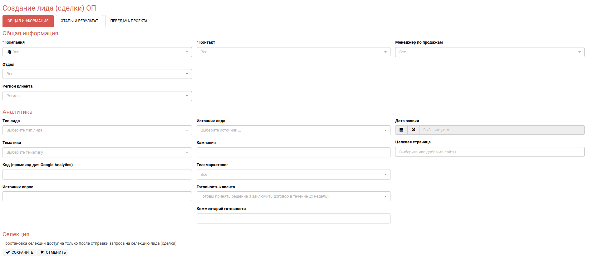 Нажав на кнопку редактировать, мы увидим множество полей, которые необходимы для описания лида и формирования сделки. Информации о лиде(сделке) много, поэтому все элементы скомпонованы в блоки.