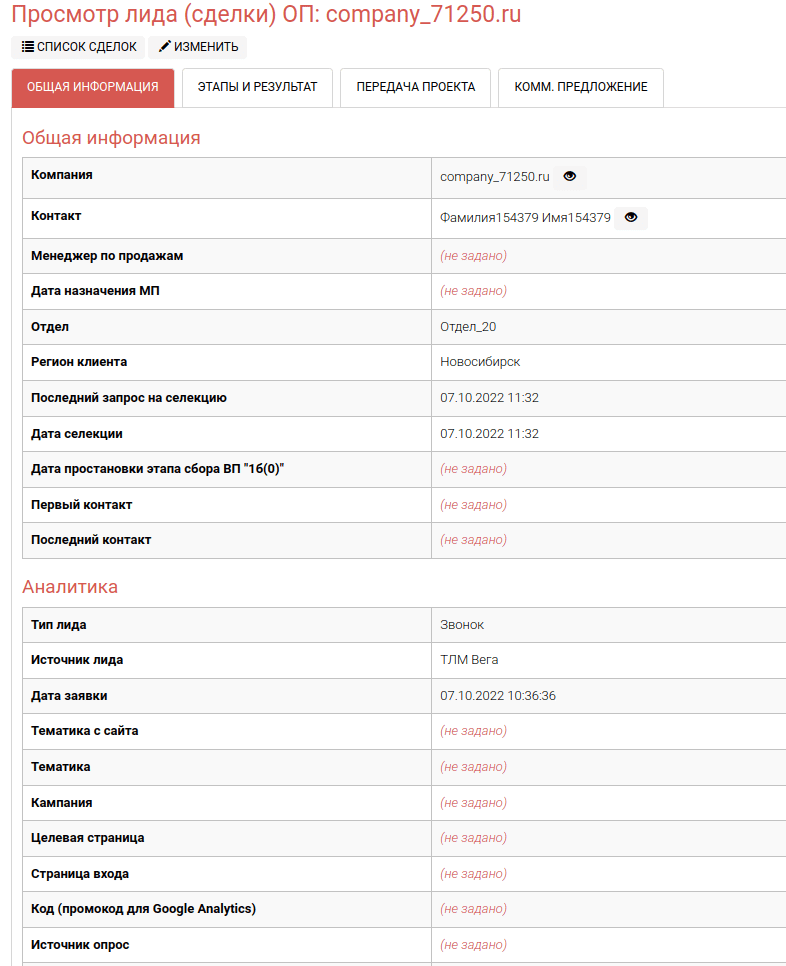 Нажав кнопку “Посмотреть лид(сделку)” мы увидим всю внесенную информацию о лиде(сделке).