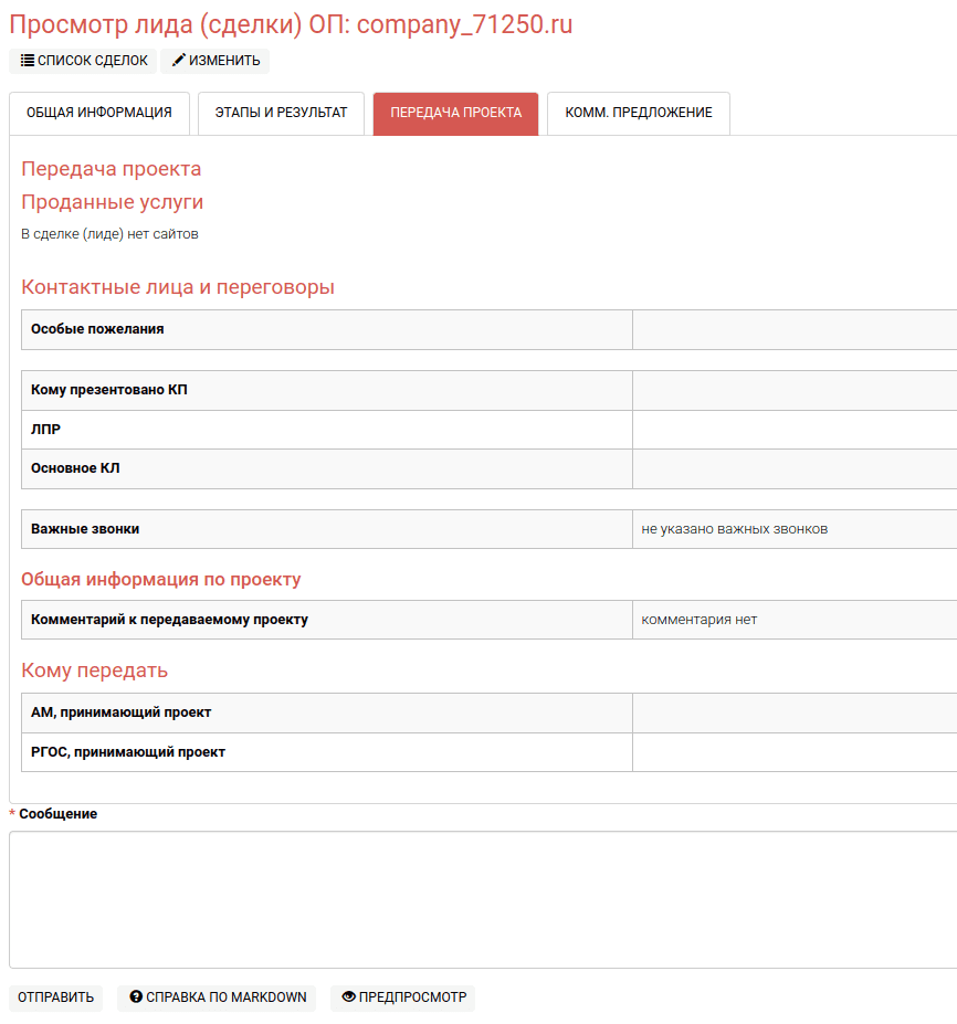 Для передачи проекта используется специальные поля, в которых менеджер по продажам заносит информацию о проекте.