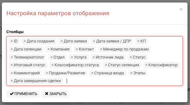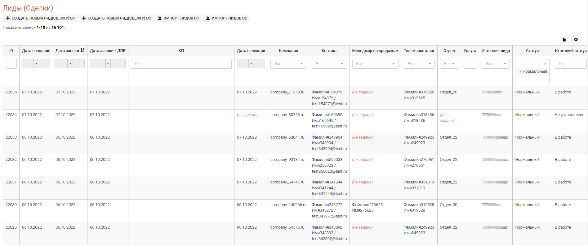 Основные характеристики по списку лидов(сделок) представлены в таблице в колонках: