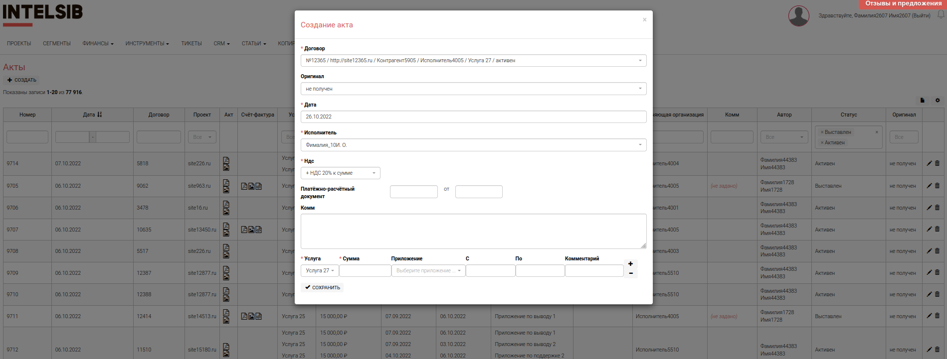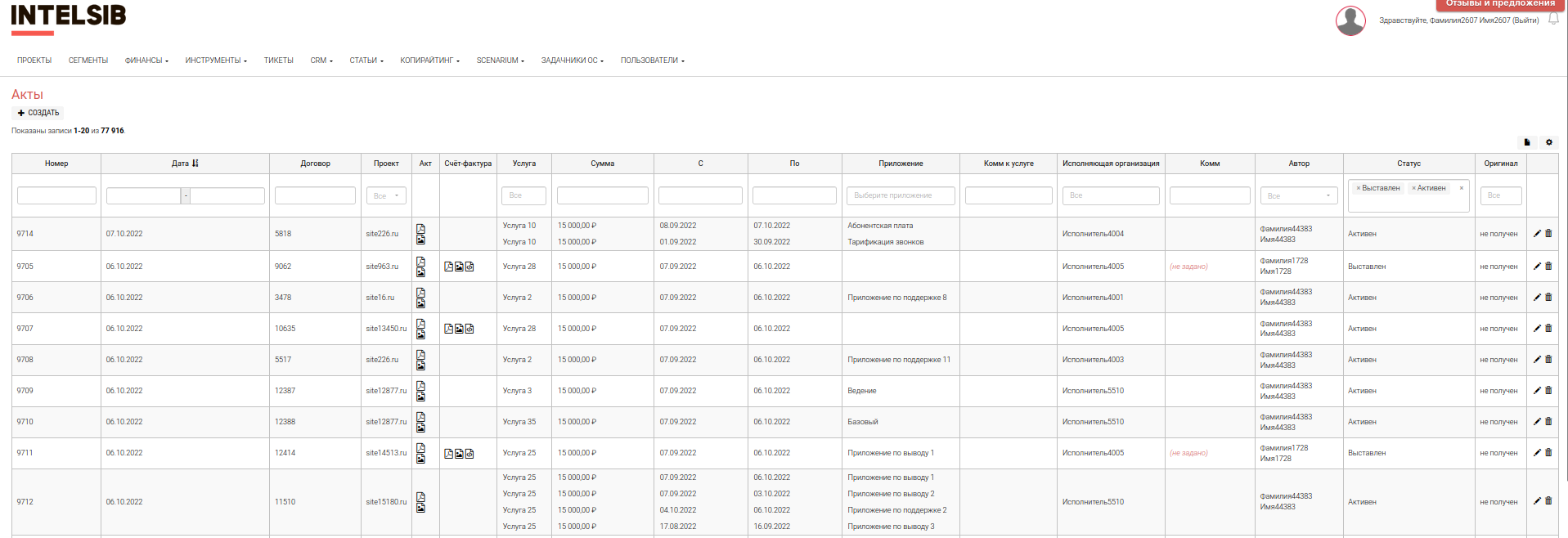 Модуль связан с модулем “Счета”, “Оплаты” и “Акт сверки”. Основная связка этих модулей определяется по номеру договора и привязанному к нему проекту. В Акте сверки можно посмотреть все выставленные акты и проведенные оплаты Заказчиком, узнать задолженность или переплату по договору. А на основании оплаченных счетов можно выставить акты оказанных услуг за соответствующий период.