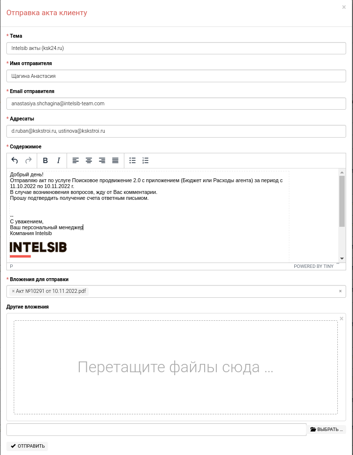 Модуль позволяет отправлять созданные акты на e-mail Заказчика с e-mail персонального менеджера проекта. Для отправки необходимо нажать на значок конверта и проверить данные: почта адресата, сопроводительный текст (шаблон подставляется автоматом для каждой услуги), прикрепленные акты. Также есть возможность прикрепить другие документы, если это требуется (например отчеты). Нажать кнопку “Отправить”. Таким образом, персональный менеджер проекта может ежедневно контролировать отправленные акты по своим проектам.