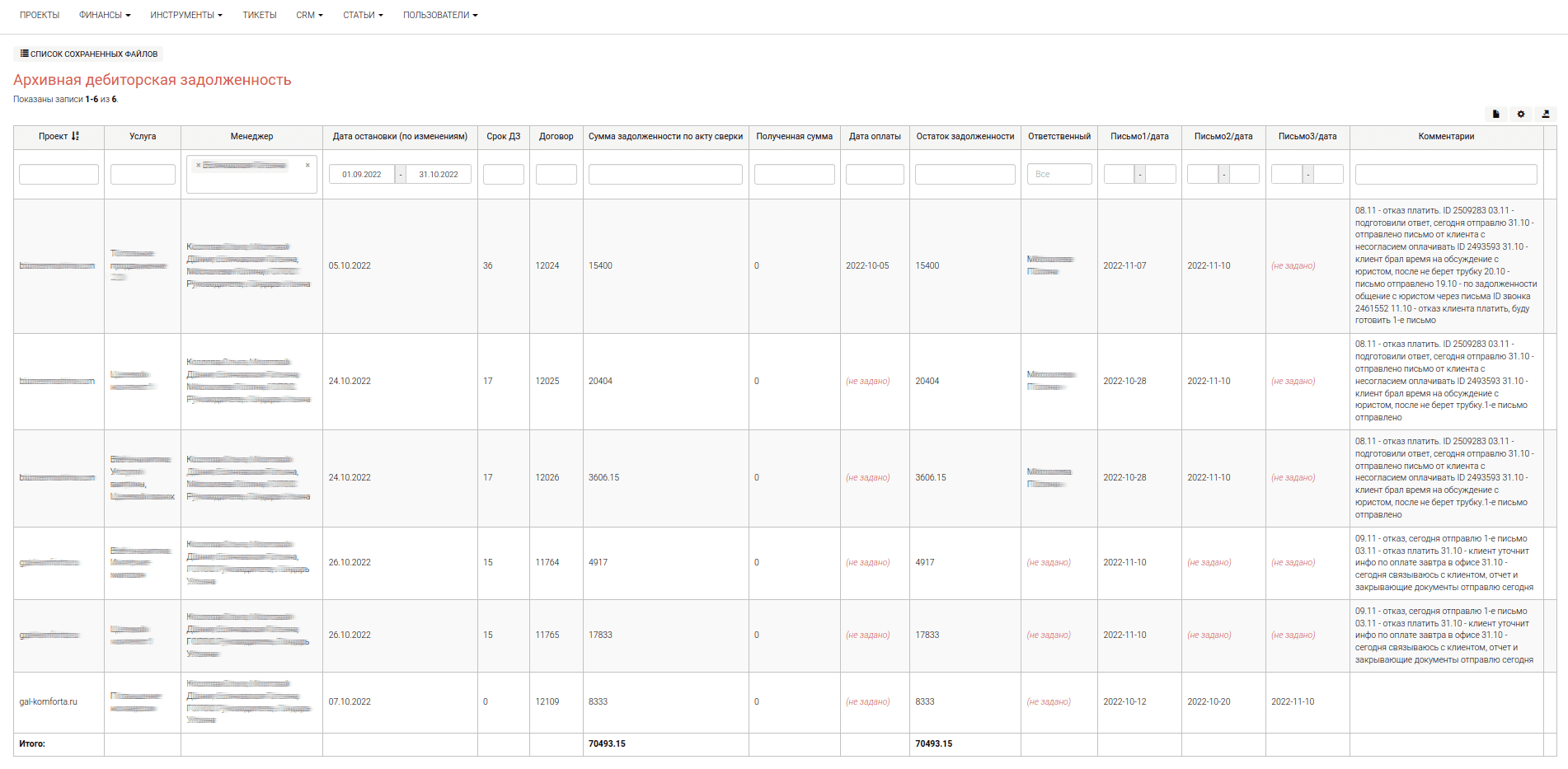 Архивная ДЗ представляет собой сводную информацию по всем неоплаченным счетам остановленных проектов Заказчиков с возможностью фильтрации. Общий список инструмента имеет следующие параметры: