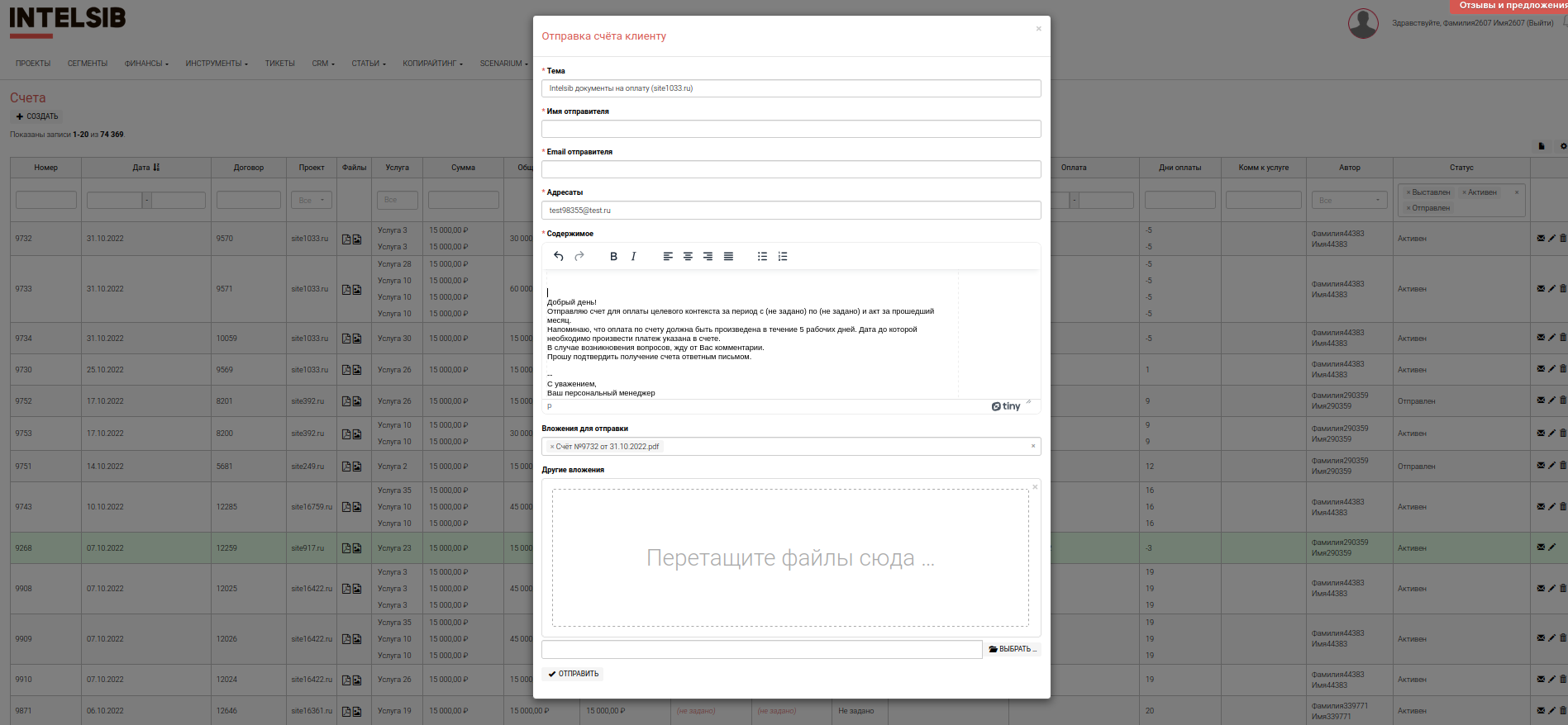 Модуль позволяет отправлять созданные счета на e-mail Заказчика с e-mail персонального менеджера проекта. Для отправки необходимо нажать на значок конверта и проверить данные: почта адресата, сопроводительный текст (шаблон подставляется автоматом для каждой услуги), прикрепленные счета. Также есть возможность прикрепить другие документы, если это требуется (например акты, отчеты). Нажать кнопку “Отправить”. Таким образом, персональный менеджер проекта может ежедневно контролировать отправленные счета по своим проектам и своевременно получать оплаты от Заказчиков.