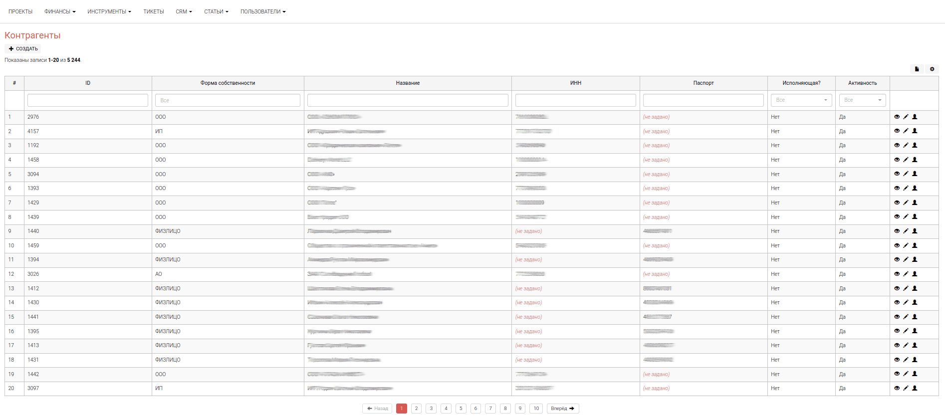 Модуль связан с модулем “Договоры”, “Документы”, “Счета”, “Акты”. Основная связка: Контрагент -> Номер договора -> Название проекта -> Список документов (Счетов, Актов) по номеру договора или названию проекта.
