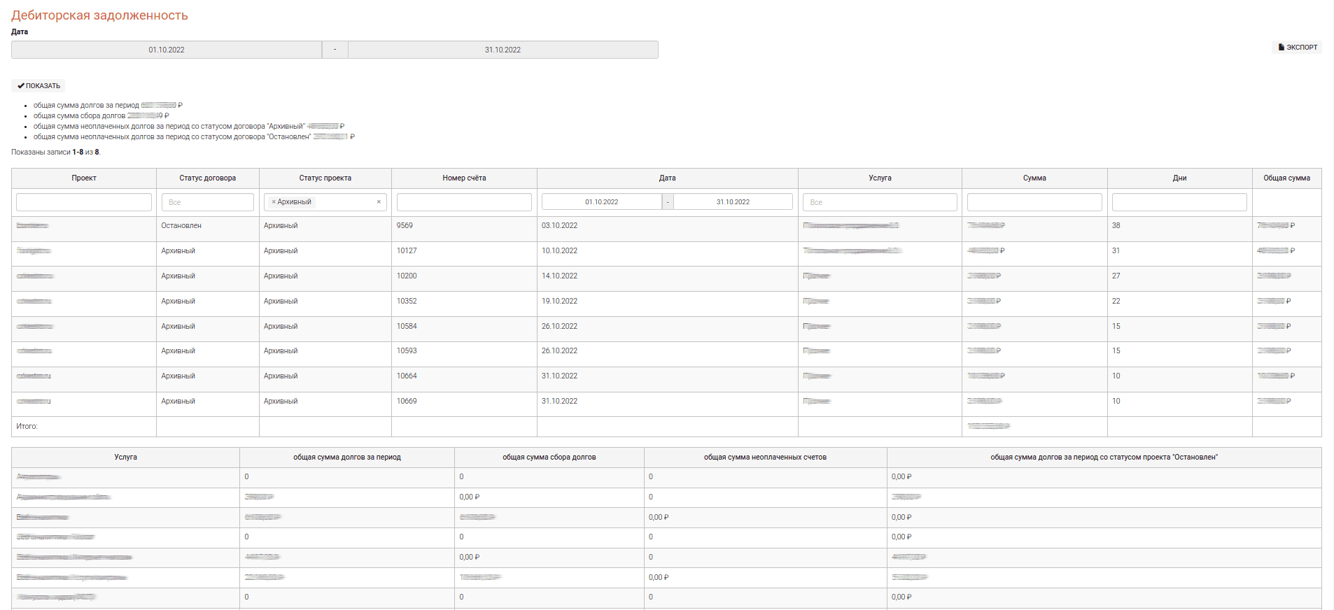 Для наглядности пользователю предоставляются характеристики дебиторской задолженности: просрочка, услуги и типы услуг, номера счетов,суммы, дни неоплаты. Модуль позволяет проанализировать дебиторскую задолженность по разным критериям фильтрации.