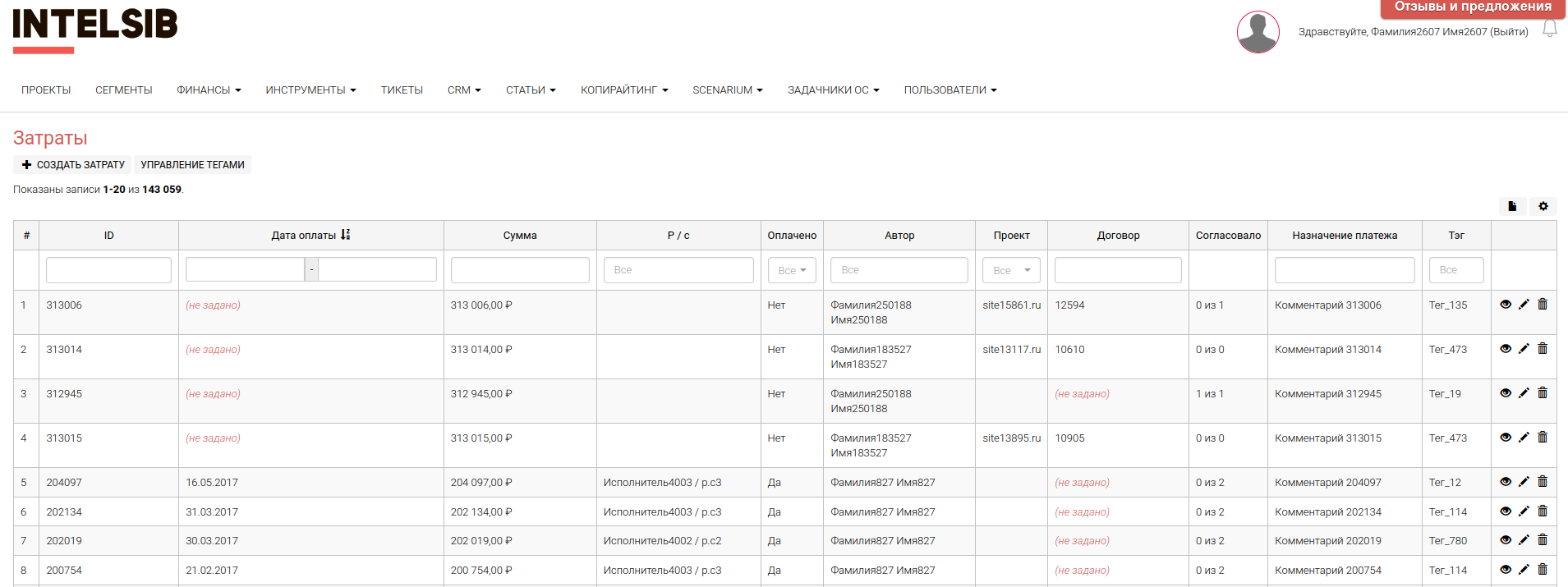 Модуль позволяет вести реестр расходов компании, а также сортировать, группировать и анализировать их во всевозможных срезах.
