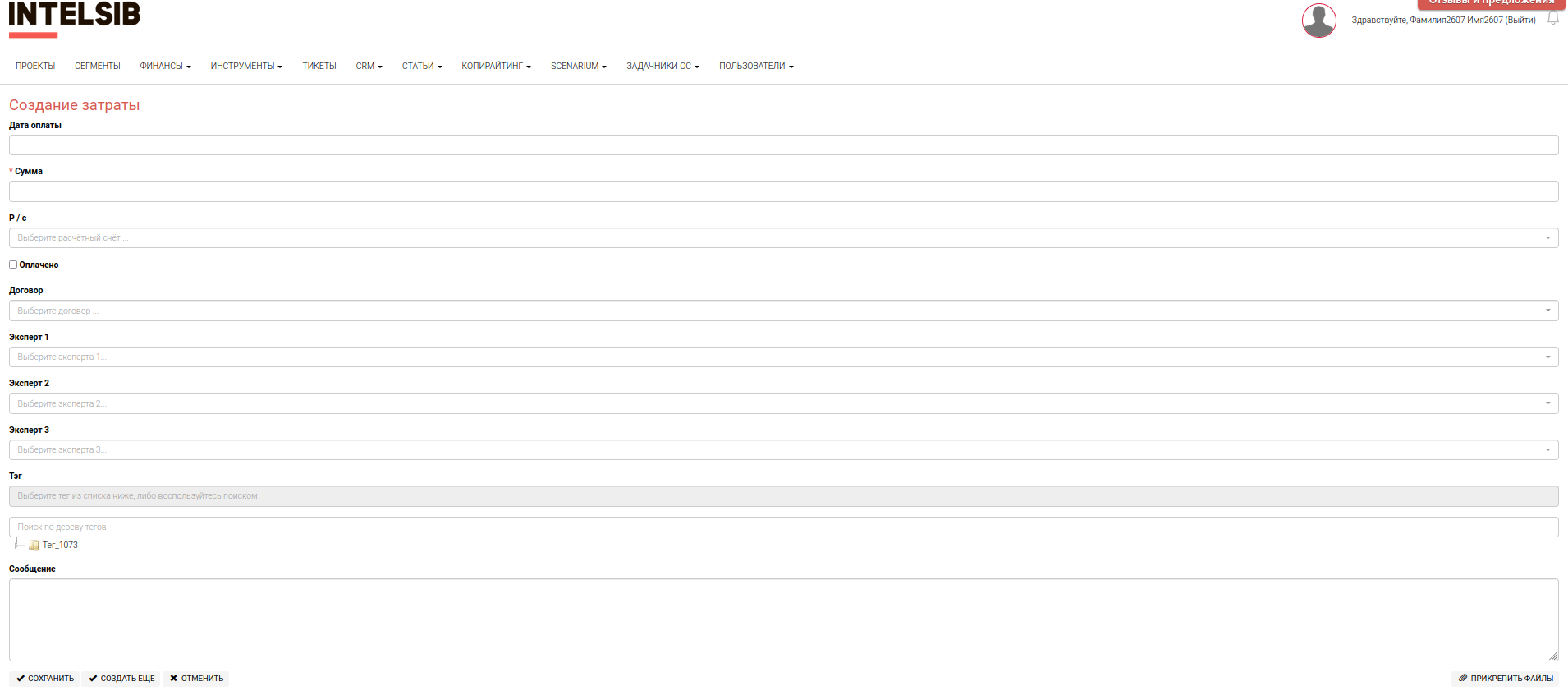 Для создания затраты необходимо нажать на кнопку Создать и заполнить следующие поля: