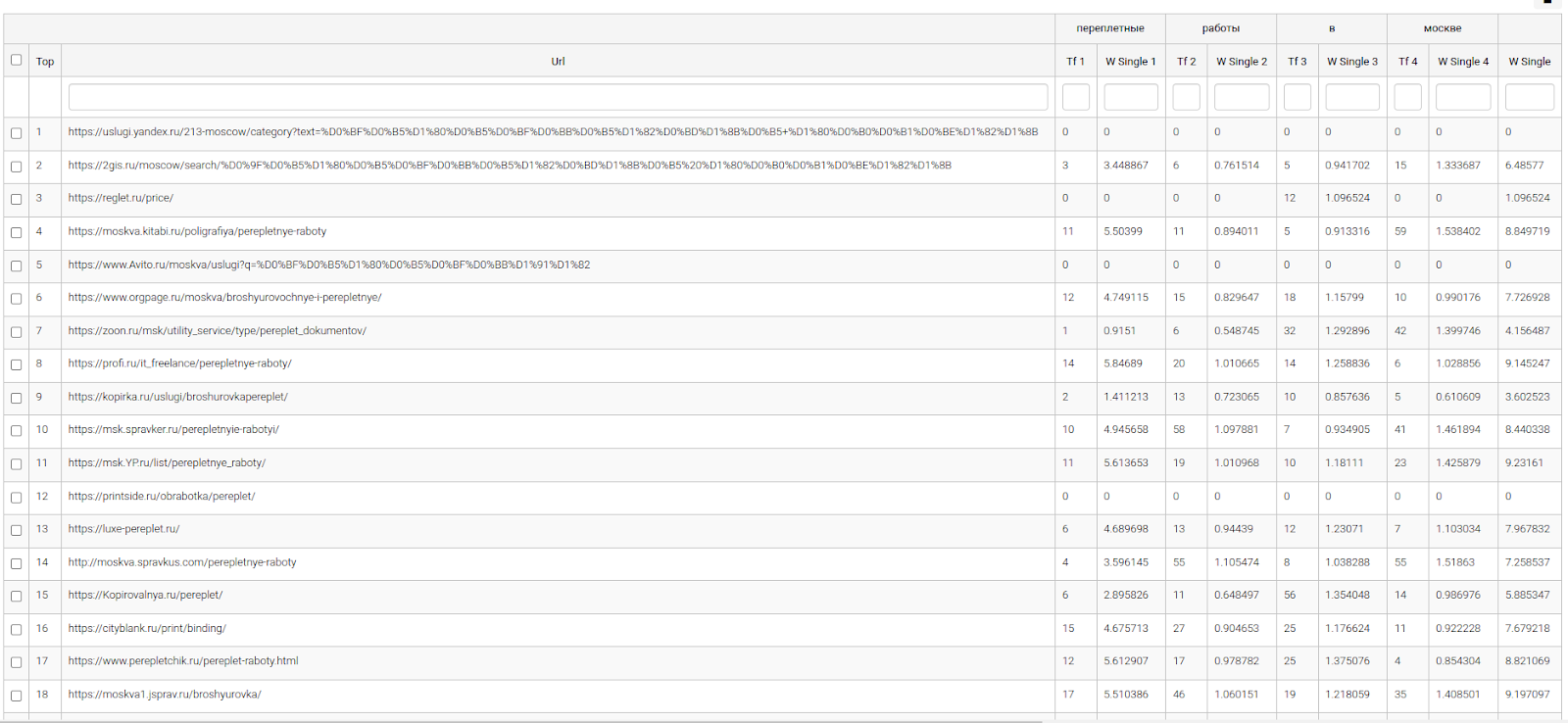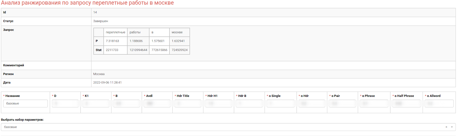 Анализ ранжирования по Yandex - это инструмент для расчета веса слов и определения их “значимости” в запросе для поисковой выдачи относительно вхождения этого запроса в текста документов в топ-30.