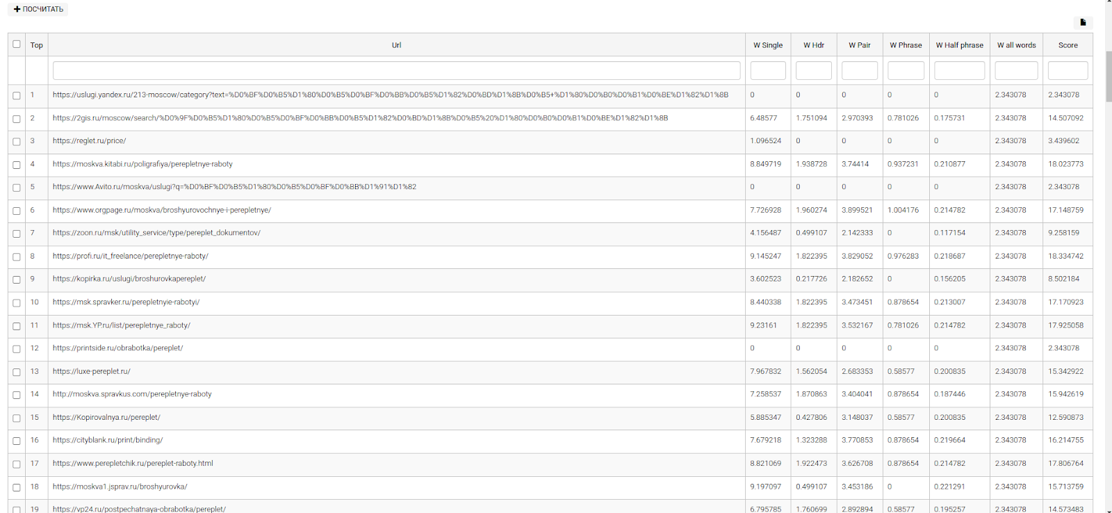 Ниже будут представлены 5 таблиц по расчету веса слов по каждому документу в топ-30 выдаче Яндекса, а также рассчитан вес биграм, составленных из слов запроса.