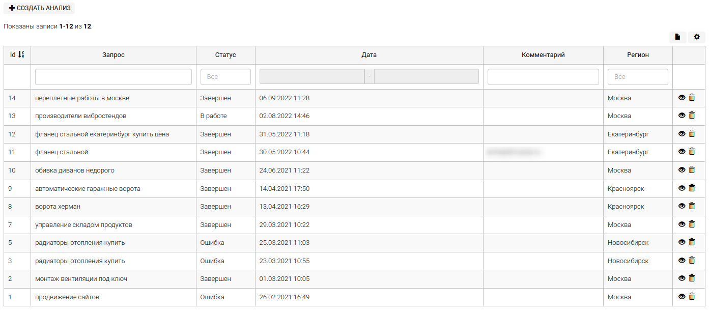 “Дашборд анализов текстового ранжирования” позволяет увидеть список поставленных задач за все время. Функционал инструмента позволяет отсортировать задачи: