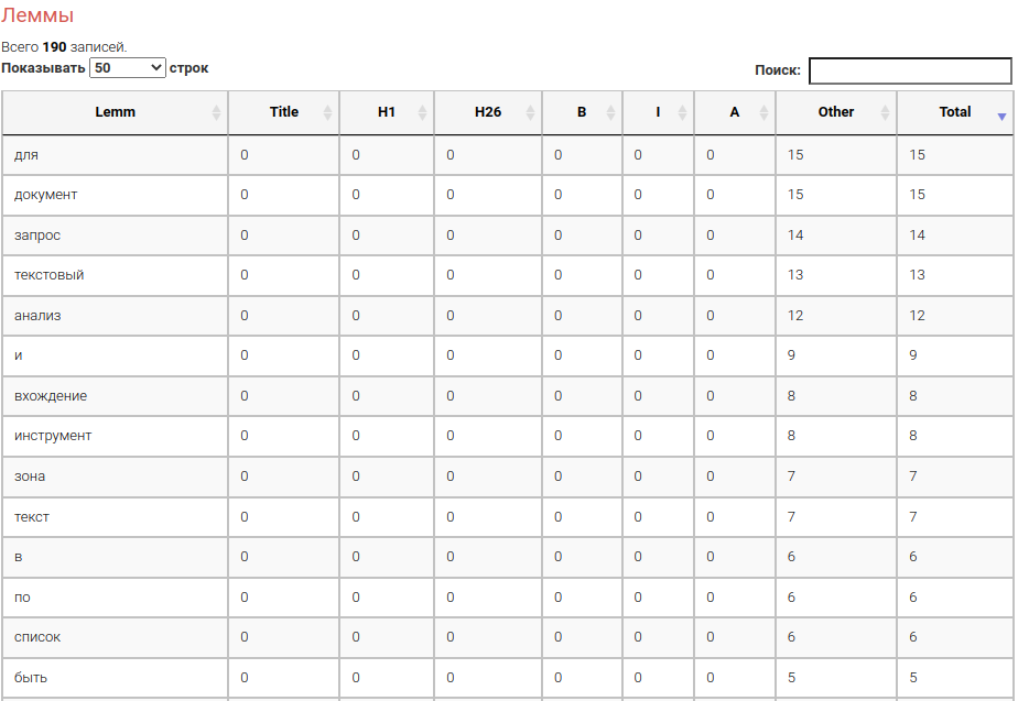 В данной таблице приведены все леммы текста (исходного кода), который был добавлен для анализа. Разберем таблицу по всем столбцам: