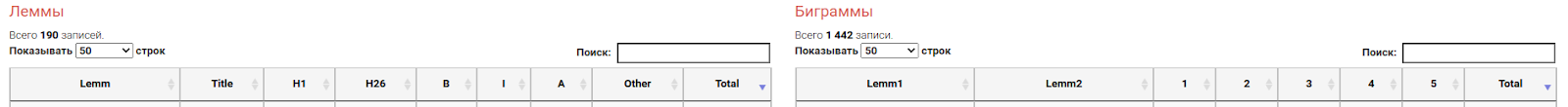 Результатом работы инструмента является две таблички: “Леммы” и “Биграммы”