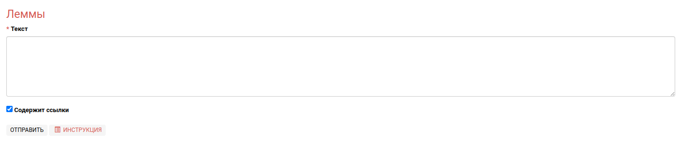 В основное поле “текст” можно вставить как обычный текст, так и ссылку на документ. Для вставки также доступен исходный код документа. Для указания обработки ссылки или исходного кода необходимо установить галочку “содержит ссылки”. Если нужно проанализировать текст, то данное поле должно быть отключено.