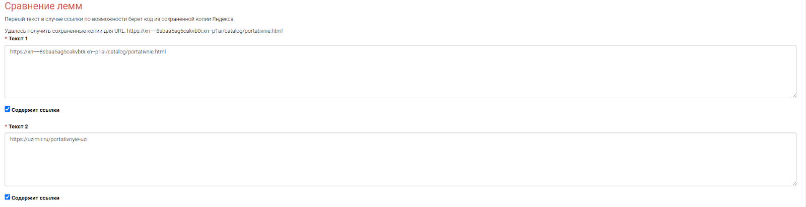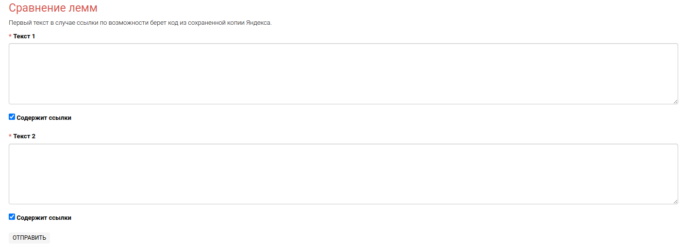 Стартовый экран представлен двумя блоками, куда можно вводить необходимые для анализа текста. Формат ввода текстов может быть как обычный текст, тогда галочки “содержит ссылки” необходимо снимать, чтобы анализатор прорабатывал как текстовый материал, так и ввод урлов (ссылок) или код страницы. При работе со ссылками инструмент выгружает код страницы, определяет html разметку и проводит подсчет лемм в тексте.