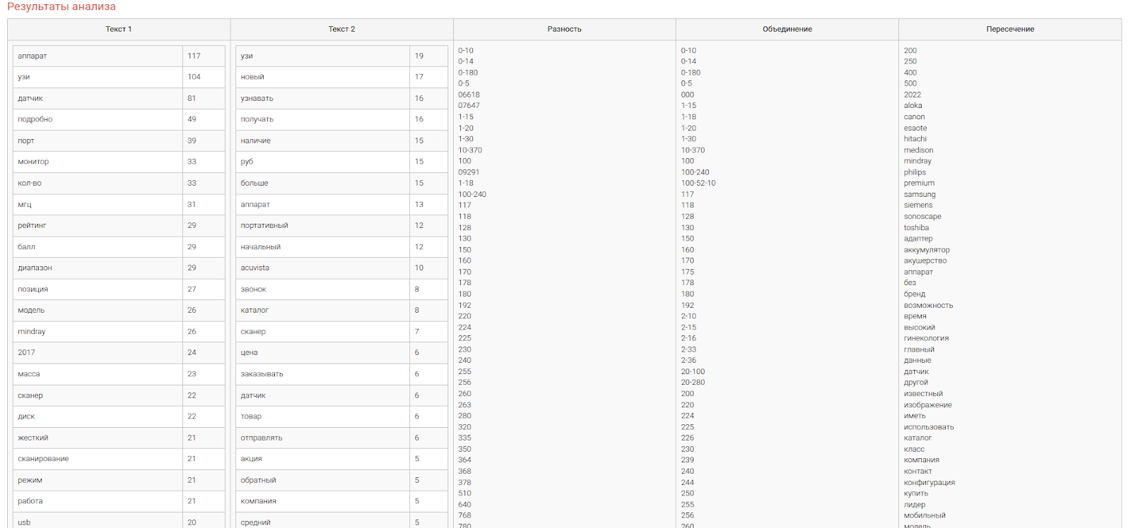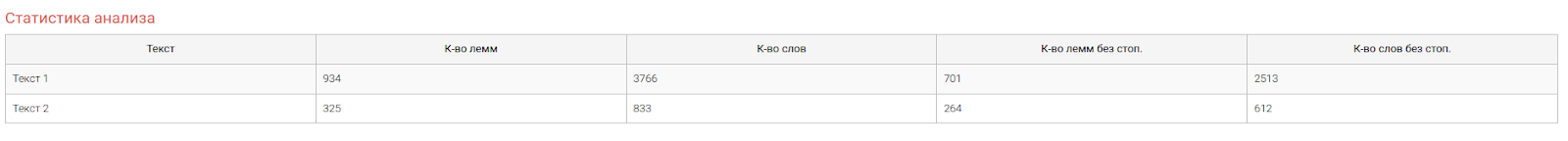 Ключевой блок данного инструмента это представление всех подсчитанных лемм для заданных текстов.