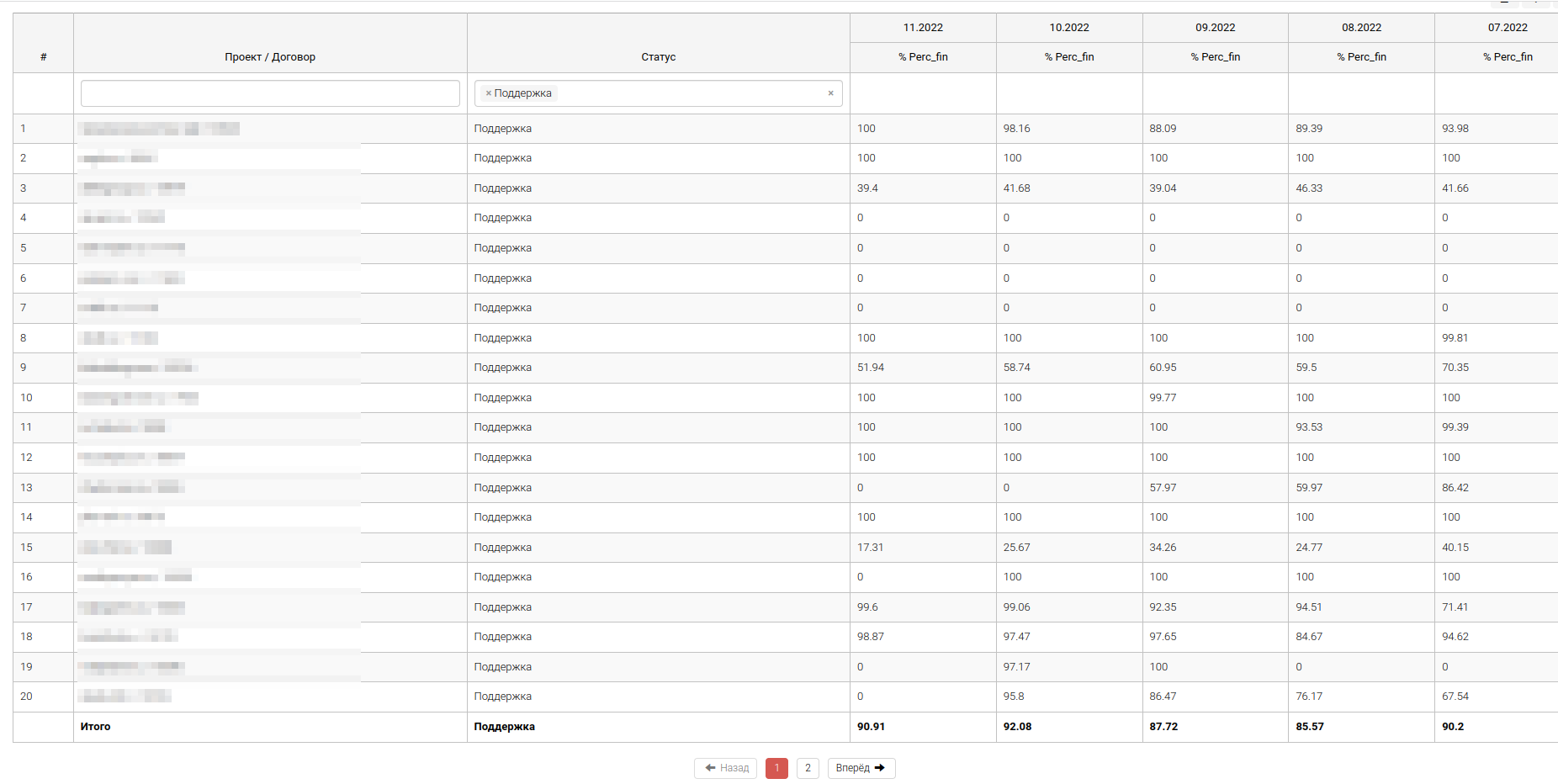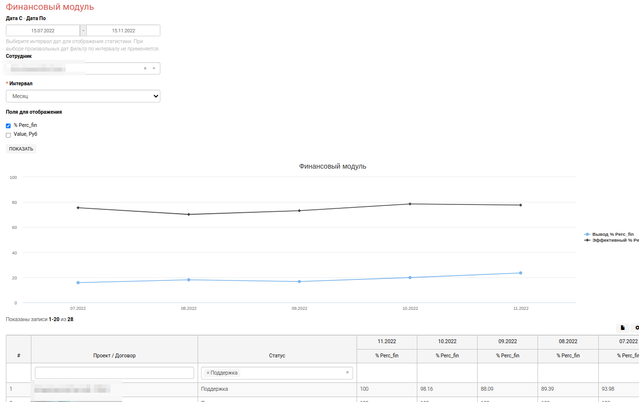 Инструмент показывает различные метрики финансовой эффективности по любому из проектов за весь период работы с ним.