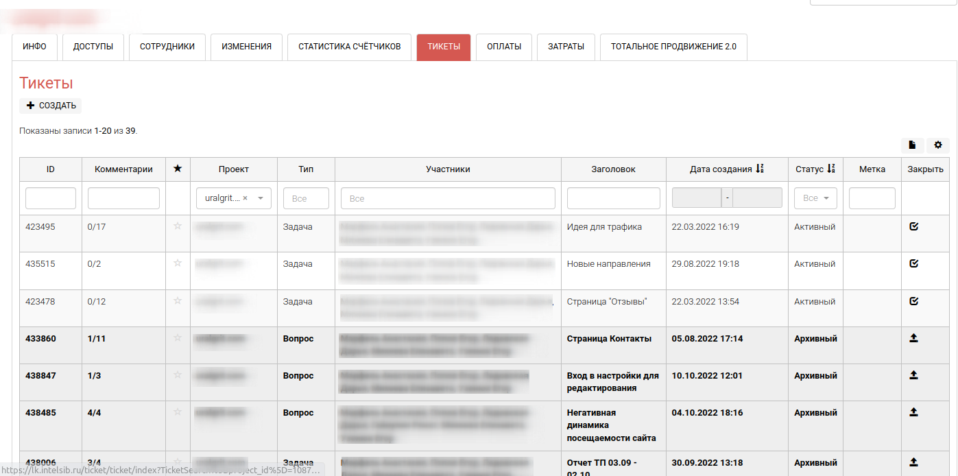 Данный блок содержит в себе полный перечень тикетов (задач), которые были поставлены в текущем проекте.