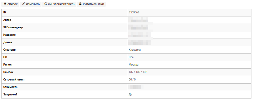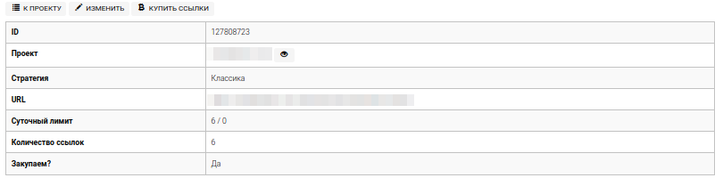 На главной странице проекта доступен просмотр первоначальных настроек по закупке, функциональные кнопки и таблица с URL-адресами для закупки на них ссылок.