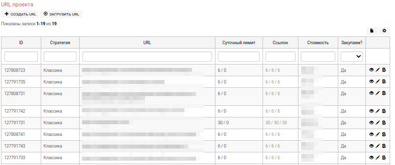 Добавление URL’ов производится на главной странице проекта. Ниже отображения настроек проекта доступна таблица, содержащая адреса страниц для закупки. Таблицы имеет две функциональные кнопки: