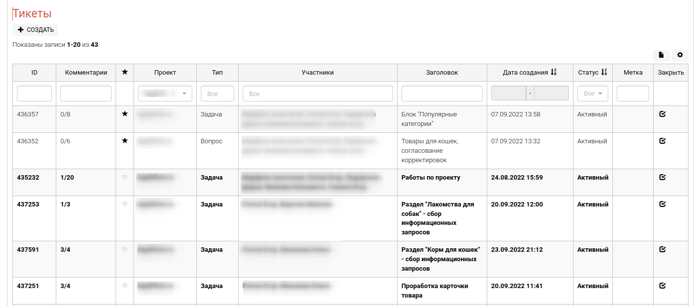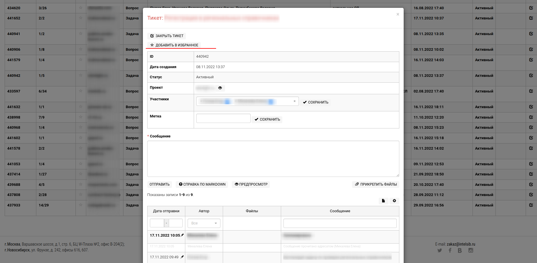Данный блок содержит в себе перечень тикетов (задач), которые специалист отметил пометкой "избранное". Для того, чтобы тикет попал в блок "Избранное" необходимо кликнуть по кнопке "Добавить в избранное" в нужного тикета.