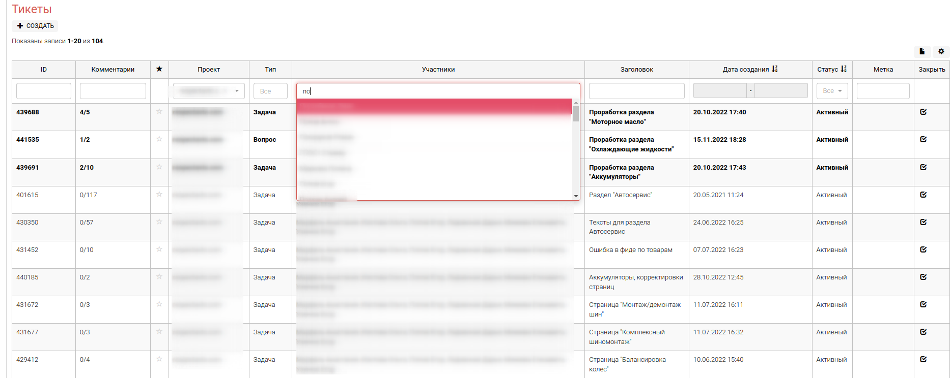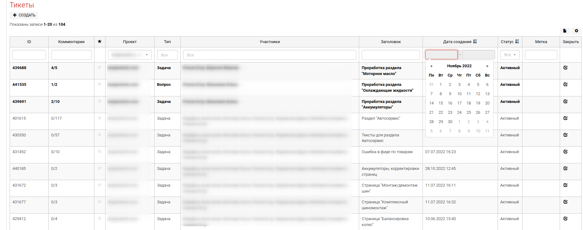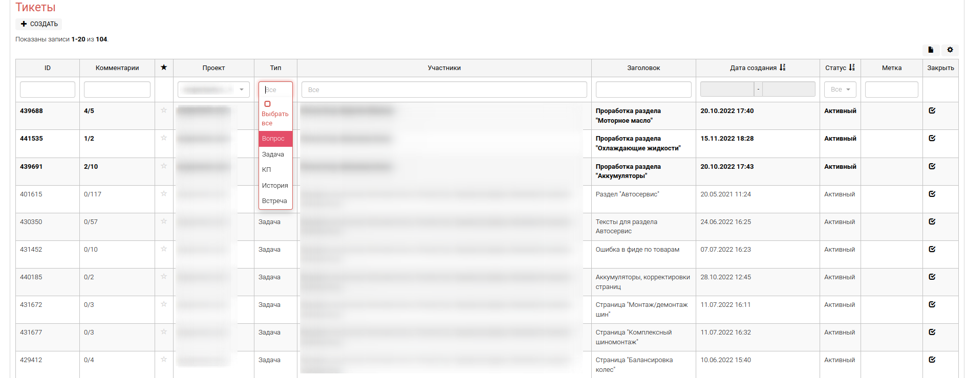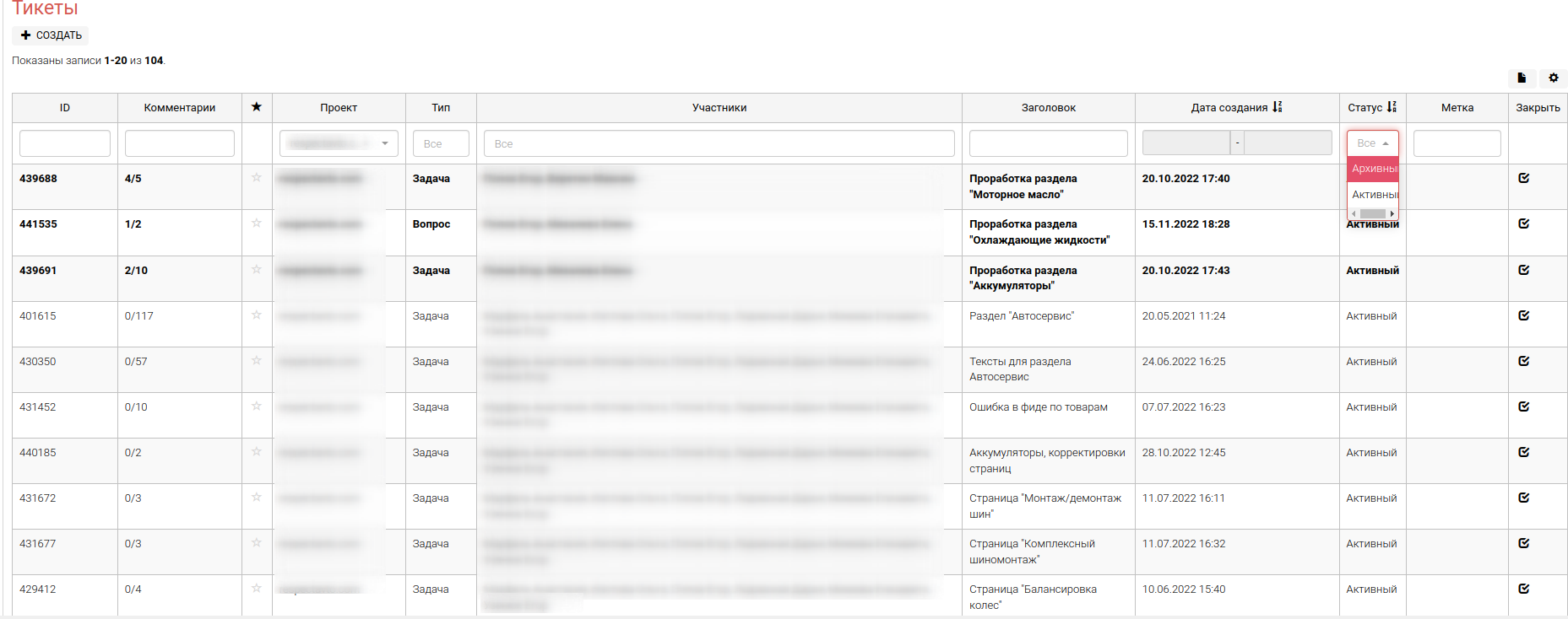 Данный блок содержит в себе полный перечень тикетов (задач), которые были поставлены в текущем проекте.